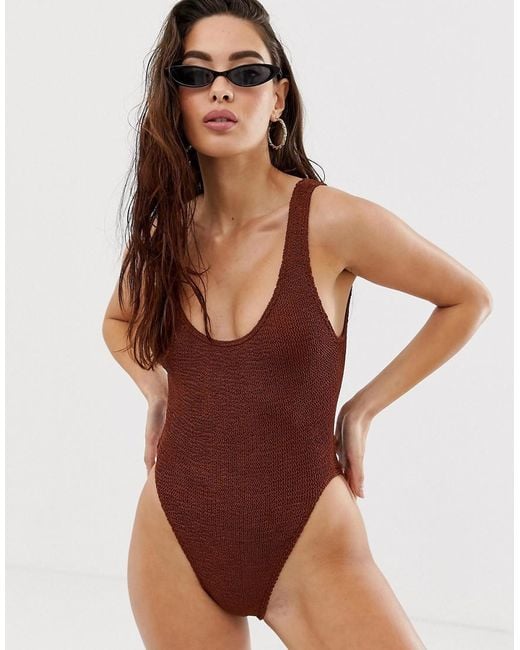 Asos Crinkle Scoop Neck High Leg Swimsuit In Shiny Brown Lyst